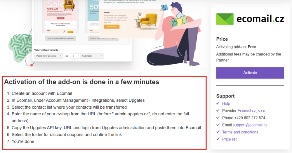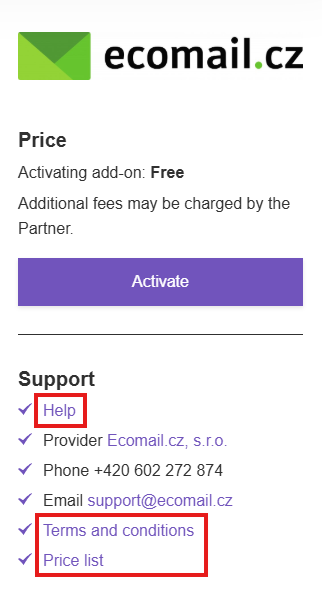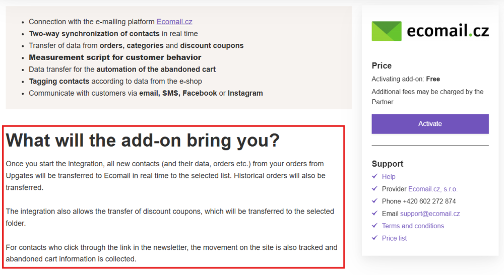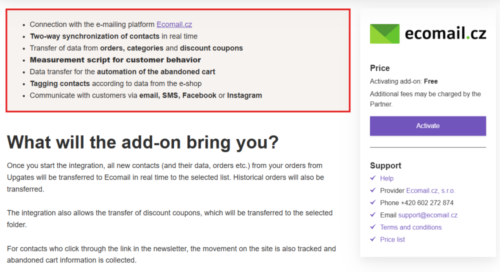 A condition for a verified add-on is that its activation is completely free from Upgates. This means that the client has the option to click Activate add-on in the administration without any restrictions on the amount uploaded to the wallet, etc. The customer therefore pays the price on your side (monthly/annual flat rate, additional services, etc.). There is no price invoicing on the Upgates side.